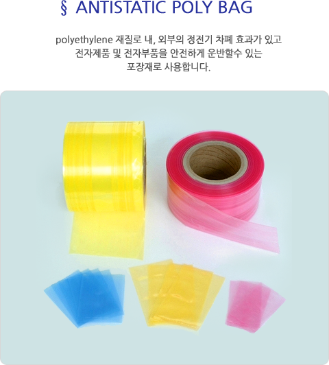 용도 정전기 및 습기에 민감한 각종 IC Chip, LCD, 반도체, 부품등을 포장시 사용 합니다. 규격 고객이 원하시는 규격을 별도 주문하실수 있습니다. (두께, 사이즈, 사양 등) 특징 내, 외부적으로 발생되는 정전기를 완전 차폐합니다. Thickness 0.04mm~0.15mm Surface Resistivity 1011-1012 Ω